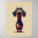 A charming, stylized illustration of a dachshund with exaggerated features and expressive eyes, rendered in a painterly, modern art style. Warm reds, deep blues, and soft textures give the character a playful yet artistic personality. Perfect for children’s art, posters, branding, prints, and contemporary digital illustrations.