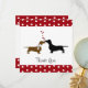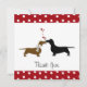 Sweet brown and black dachshunds sharing a smooch, with hearts between them, against a white background. Red and white polka dot border, on the top and bottom of the card. Thank you in black script text, under the dogs. The same polka dot border, on the backside of the card, with blank space for your own text.