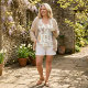 First-time purchasing one of my a design from my own shop for myself. Was thrilled with the lovely fabric (nice, soft, smooth like cotton, but it’s poly!) Fit like a dream and sits nicely in the sides and hips. Loving the smooth, nicely sewn trim at arms and neckline (see pix). Thanx for a job well done! — Di. Also thrilled that the black IS black which looks great with the snappy white fabric—the pattern is well-printed and very flattering on me. The subtle pussywillows in the design are perfect. Kudos to the print company and sewists! — Di