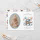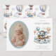 Celebrate your newest arrival with this whimsical "Adventure Awaits" birth announcement. Featuring a charming hand-painted watercolor elephant flying an airplane through soft clouds and colorful hot air balloons, this design is perfect for a baby boy's debut. The card includes a classic oval photo frame to showcase your little one's first portrait alongside their birth details. Easily personalize the name, date, weight, and parents' names to create a timeless keepsake for friends and family.