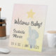 Whimsical Sip & See new baby / baby shower tabletop pedestal sign features baby elephant with star and fully customizable text on pastel gradient background.
