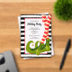 Elf legs in striped tights and green boots on black and white stripes and gold dots, these Christmas party invitation are fun for any holiday occasion. MATCHING items in our store.