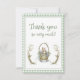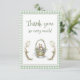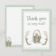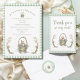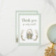 A charming and delicate baby shower thank you card featuring a soft pastel palette with a green gingham frame. The design incorporates sweet illustrations of fairytale accents in sweeping greens and vines. The design also has soft hues of blue blush pink, sage green. Whimsical flowers and greenery surrounds the sweet animal graphic giving it an elegant yet playful touch. Perfect for welcoming any gender baby.