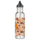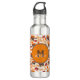 Whimsical Fall theme stainless steel water bottle features wheelbarrows of pumpkins, small floral bouquets and pale orange and white stripes. Customize with name and initial