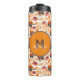 Whimsical Fall thermal tumbler features wheelbarrows of pumpkins, small floral bouquets and pale orange and white stripes. Customize with name and initial
