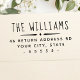 Return address rubber stamp featuring your surname/family name in a whimsical style font and the address below beneath a separating divider