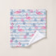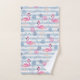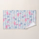 Towel set with a pattern with a fun summery vibe. Pink flamingos and pineapples set on a light blue striped pattern with leaves and hearts all around.