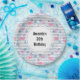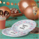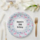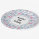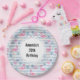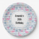 Birthday paper plates with a pattern with a fun summery vibe. Pink flamingos and pineapples set on a light blue striped pattern with leaves and hearts all around.