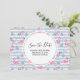 Save the date card a pattern with a fun summery vibe. Pink flamingos and pineapples set on a light blue striped pattern with leaves and hearts all around.
