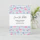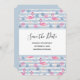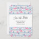 Save the date card a pattern with a fun summery vibe. Pink flamingos and pineapples set on a light blue striped pattern with leaves and hearts all around.
