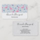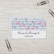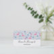 Business cards with a pattern with a fun summery vibe. Pink flamingos and pineapples set on a light blue striped pattern with leaves and hearts all around.