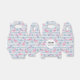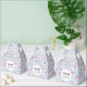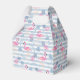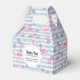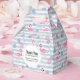 A tiny favor box with a pattern with a fun summery vibe. Pink flamingos and pineapples set on a light blue striped pattern with leaves and hearts all around.