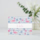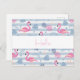A hello postcard a pattern with a fun summery vibe. Pink flamingos and pineapples set on a light blue striped pattern with leaves and hearts all around.