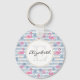 A key chain with a pattern with a fun summery vibe. Pink flamingos and pineapples set on a light blue striped pattern with leaves and hearts all around.
