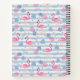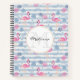 A personalized spiral notebook with a pattern with a fun summery vibe. Pink flamingos and pineapples set on a light blue striped pattern with leaves and hearts all around.