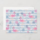 A postcard a pattern with a fun summery vibe. Pink flamingos and pineapples set on a light blue striped pattern with leaves and hearts all around.