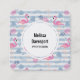 Business cards with a pattern with a fun summery vibe. Pink flamingos and pineapples set on a light blue striped pattern with leaves and hearts all around.