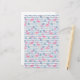 Stationery paper with a pattern with a fun summery vibe. Pink flamingos and pineapples set on a light blue striped pattern with leaves and hearts all around.