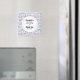 A birthday favor magnet with a pattern with a fun summery vibe. Pink flamingos and pineapples set on a light blue striped pattern with leaves and hearts all around.
