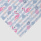 Tissue paper with a pattern with a fun summery vibe. Pink flamingos and pineapples set on a light blue striped pattern with leaves and hearts all around.