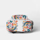 This backpack features a luxurious pattern of floral swirls painted in vibrant shades of orange, teal, red, and green, dancing across a crisp white fabric.