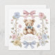 Announce your baby shower with a touch of playful elegance using this charming teddy bear themed invitation. The centerpiece is a delightful teddy bear adorned with a sweet blue bow, surrounded by a beautiful arrangement of pastel flowers and delicate greenery. The elegant script and soft color palette create a sophisticated yet heartwarming feel, perfect for celebrating mom to be's special day. This card is sure to set a joyful tone for your baby shower fun.