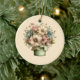 An ornament with a cute image. Blue. pink and cream colored flowers with green leaves. Set inside a green flower pot with a green plaid cloth hanging over the side.