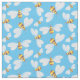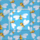 Cute flying bumble / honey bees flying art fabric. Whimsical repeat pattern fabric in shades of blue, yellow and brown. Ideal fabric for a nursery or kids insect or nature themed room. Uniquely painted in watercolor and designed by Sarah Trett.