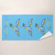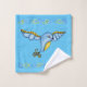 This set of bath towels that includes a wash towel, hand towel, and bath towel are blue with flying whimsical bluebirds that have yellow accents and scrolled tails. Fancy scrolled border is at the top and bottom. Purchase the whole set or individually.