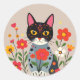 Whimsical Folk Art Black Cat and Flowers Classic Round Sticker