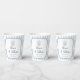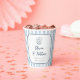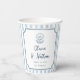 Wedding paper cups to match our Whimsical Retro Blue Stripes Wedding collection. This design features a navy blue, hand drawn frame against a light blue striped background. At the top, there is a doodle scribble illustration of a diamond ring in a seashell ring box. Your names appear in a whimsical calligraphy font. Custom paper cups, perfect for serving drinks at the bar, dessert table, and more. View the collection linked on this page for the full wedding suite. Feel free to message me with any questions, I'll be happy to help!