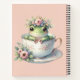 A charming green frog peeks out of a delicate porcelain teacup adorned with soft pink blossoms and gold trim, crowned with a wreath of pastel florals and a tiny royal crown. This endearing scene blends fairytale whimsy with cottagecore elegance, evoking gentle nostalgia and playful storybook vibes. Rendered in a dreamy watercolor style, this sweet composition captures the magic of tea parties and nature’s smallest royalty. Ideal for lovers of frogs, florals, and vintage flair. AI generated artwork.