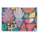 The image is a vibrant and whimsical abstract pattern set against a dark blue background. It features a playful mix of organic shapes resembling flowers, coral, and leaves, alongside geometric forms like circles, triangles, and stripes. These elements are rendered in a bold and colorful palette, with shades of pink, orange, yellow, green, and blue dominating the composition. The textures are diverse, ranging from smooth and flat to patterned and textured, adding depth and visual interest. The overall effect is lively, energetic, and suggestive of a playful and imaginative aesthetic.