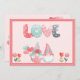 This whimsical gnome couple is clearly in love. They're all dressed up in their finery and she's holding a bouquet of heart shaped balloons that her sweetheart gave her. Above it says LOVE, which is decorated with hearts and polka dots. The reverse is done in a soft pink background with heart balloons in the top right corner and a little chick with a bouquet of balloons in the lower left corner. It says "Gnome Body Loves You Like I Do, All my Love Forever, Love NAME. All of the text is customizable so you can change it to whatever you like. An adorable Valentine's Card for your sweetheart!