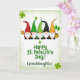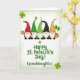 This greeting card shows five gnomes lined up across the upper third, their long white beards and rosy noses turned toward one another like close friends sharing a joke 💚. Each wears a pointed hat in bright colors with dots and stripes, and one hat carries a tiny shamrock for an extra nod to the day ☘️. Behind them, a pale green-to-white gradient keeps the scene airy while scattered shamrocks float around the group. On the far left, one gnome lifts a golden mug, and his neighbors lean in as if clinking cheers without the clatter. On the far right, another gnome stands beside two green balloons and a small pot of gold, adding a little sparkle near his boots. Centered below the gnomes, the text reads “Happy St. Patrick’s Day! Granddaughter” in rich emerald green, with the words set in a flowing, looping style. Small shamrock accents sit around the lettering, and the right edge holds the balloons above the gleaming gold pot.