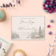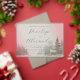 This wedding invitation features a serene winter scene with a cozy cabin nestled among tall pine trees, creating an ethereal and romantic atmosphere. The design uses a soft color palette of muted grays, whites, and deep greens, rendered in a watercolor style that adds gentle transitions and a whimsical touch. Elegant script fonts highlight the names, while simple serif fonts provide additional details, ensuring readability against the misty background. The overall mood is peaceful and intimate, perfect for celebrating a special occasion in a tranquil setting.