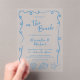 This coastal blue whimsical hand-drawn beach wedding acrylic invitation features playful coastal seashell doodles, handwritten typography with the popular phrase “on the beach”, and a relaxed seaside aesthetic perfect for oceanfront or destination weddings. Ideal for beach, coastal, and tropical celebrations, this elegant yet casual design sets the tone for a romantic seaside ceremony. Fully customizable for names, dates, and details.