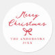 Keep it festive with these Christmas stickers featuring “Merry Christmas” in handwritten red script on a white background. A hand-drawn red bow separates the greeting from your name and year, creating a bright and cheerful design. Perfect for sealing Christmas card envelopes, decorating holiday party favors, or adding a seasonal touch to gifts and packages.
