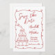 Hand Drawn Fun Swirling Frame Save the Date Card. This whimsical and creative save the date card is perfect for couples looking to set a playful, lighthearted tone for their upcoming wedding. Designed with red and white in an Italian style, the card showcases a swirling frame with charming heart details that encircle your wedding information, presented in a delightful mix of script and handwritten style fonts for a casual yet elegant feel.