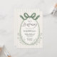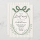 A whimsical birthday invitation with an oval frame embellished with a hand drawn green bow and neutral beige watercolor stripes pattern background. The text template has coordinating retro-inspired type face pairings ready to personalize with your event details. Feminine and stylish with old fashioned charm. These invitations may be ordered in both printed and instant download digital formats.