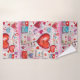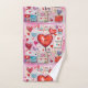 Towel set with a whimsical pattern. Scrapbook style doodles and scribbles. Red and pink hearts and various letters and envelopes scattered all around.