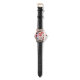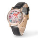 A watch with a whimsical pattern. Scrapbook style doodles and scribbles. Red and pink hearts and various letters and envelopes scattered all around.