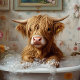 Highland Cow Bubble Bath by Nicole Cossairt is a delightfully whimsical fine art print that captures pure rustic charm with a touch of humor. Featuring a shaggy Highland cow soaking in a vintage clawfoot tub filled with bubbles and surrounded by blooming flowers, this enchanting artwork brings warmth and personality to any space.