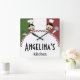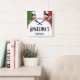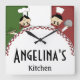 This design features a whimsical chef holding a pizza and another chef holding a serving tray. They are hiding behind a white dinner plate which has a red and white checkerboard design. There is plenty of customizable text for you to personalize this adorable clock. Red, white and green striped background completes the look.
