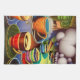 Whimsical surreal AI generated digital art dreamscape kitchen towel features colorful cups filled with coffee.