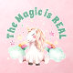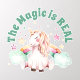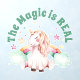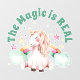 Adorable nursery wall decal features sitting unicorn with rainbow, clouds and stars. Quote reads "The Magic is Real"