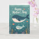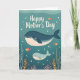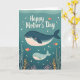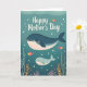 This design shows a calm underwater scene with two large sea creatures swimming close together, the bigger one in deep blue with soft pink accents on the face and the smaller one in pale aquamarine, matching its gentle, affectionate gaze ❤️. Their bodies angle toward each other as if sharing a quiet moment, creating a tender parent-and-child closeness through their expressions and spacing. The background fades from lighter blue-green near the top to deeper ocean tones below, giving the water a soothing sense of depth. Small white bubbles rise around them, adding light motion without disturbing the peaceful mood. Along the bottom edge, simple sea plants in muted coral, peach, and sage tones form a soft frame for the pair. A few small fish in orange-red and yellow swim nearby, bringing little sparks of color and energy to the scene 🌼. Across the upper area, the words “Happy Mother’s Day” appear in creamy lettering, centered and easy to read against the darker water. The lower frame is grounded by the sea flora while scattered bubbles drift upward between the fish and the two sea creatures.