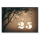 This table number card (or place card) features fireflies mason jars and hanging string lights on the brown tree branches. Perfect table number card for rustic country wedding themes.