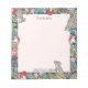 Perfect for anyone who loves mice and whimsy, this notepad can be personalized with a name for a custom look! Woodland forest mice are scurrying among leaves, ferns and flowers on a dark teal blue background. There are also berries and mushrooms for each mouse to enjoy! Greens, pinks and teal set off the gray mice. Reads, "From the desk of" at the top of the pale pink note area. Original artwork by Tuzi Williams.