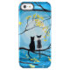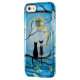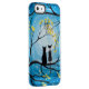 Two cats sitting on a branch watching the full moon with a blue sky filled with stars. The branches of the trees surrounding them with small yellow flowers. Black tuxedo cat and a bi-color white and grey spotted cat. Original Modern Whimsical Acrylic Painting by Donna Leger. All Rights Reserved. ©irony designs